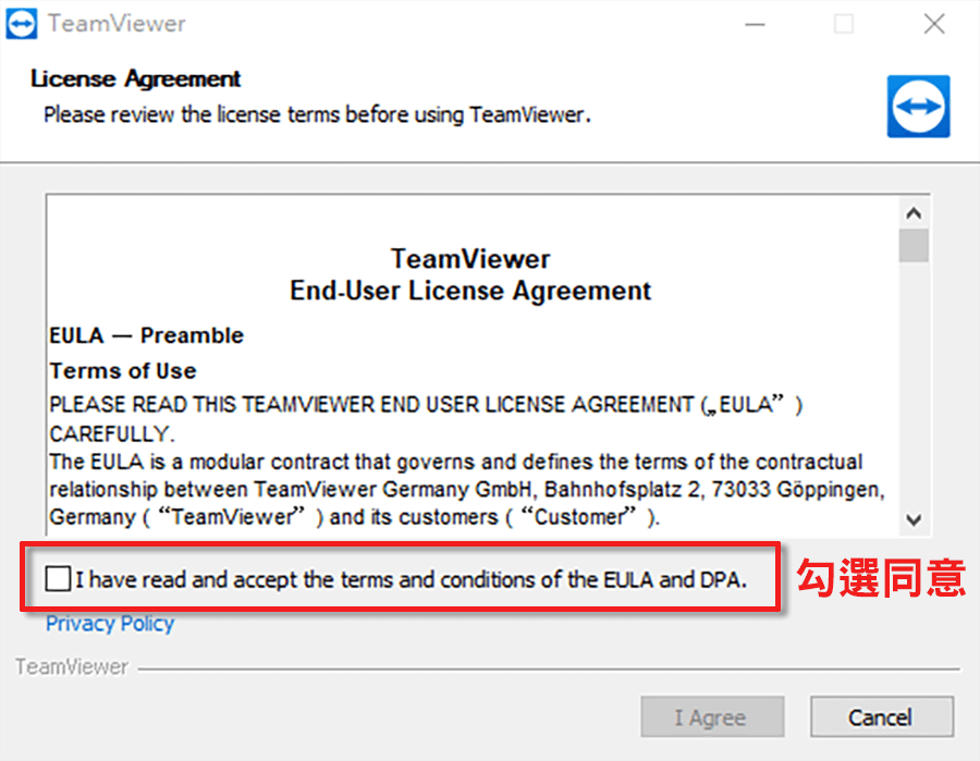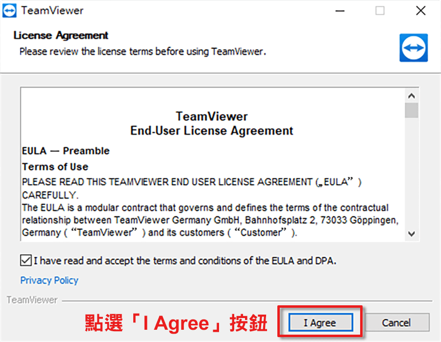 開啟程式,程式開啟後請勾選同意使用TeamViewer程式並點選「I Agree」按鈕