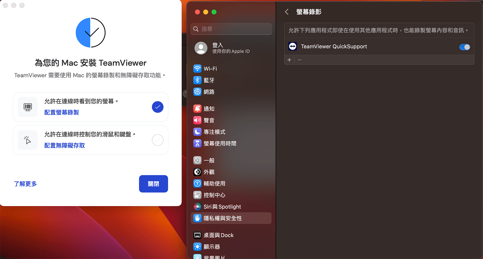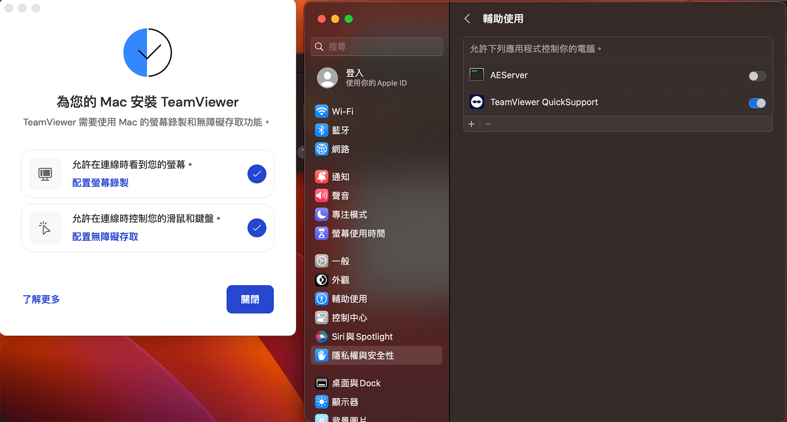 點選允許在連線時控制您的滑鼠和鍵盤中的「配置無障礙存取」→開啟「TeamViewer QuickSupport」權限 (※部分使用者需輸入系統密碼方能開啟權限)→權限開啟後,請點選關閉至「下載項目」