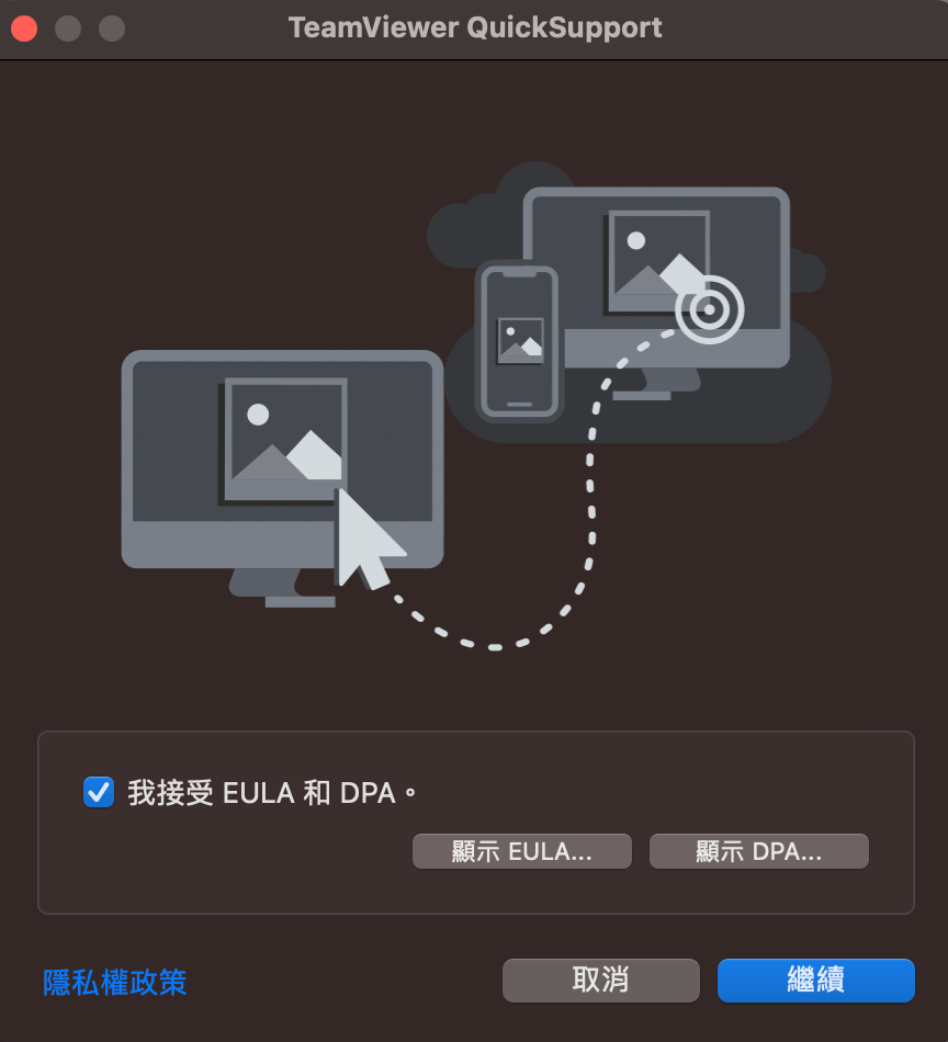 程式開啟後請勾選同意「接受EULA和DPA」的隱私權政策並點選「繼續」按鈕
